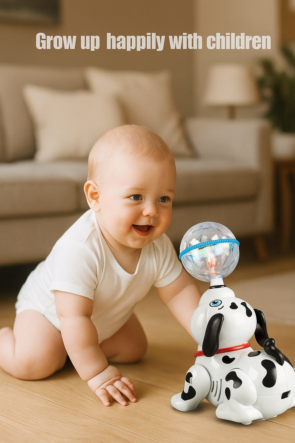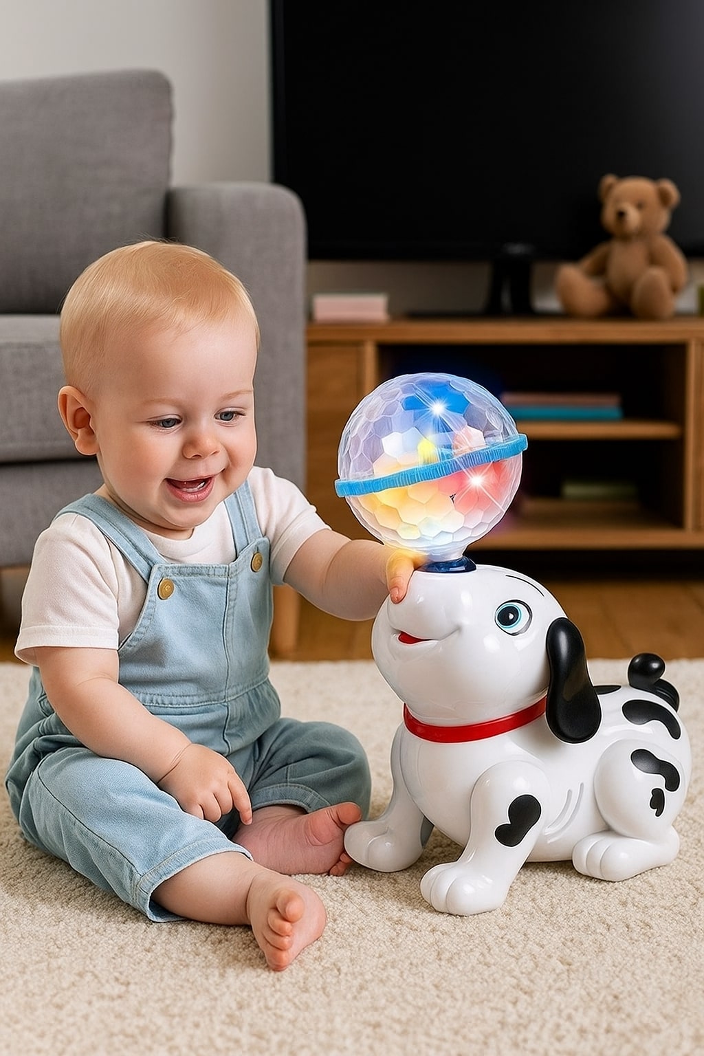 · BUMP AND GO: A rotating wheel at the base of the dog enables it to move around. Features lights and music. This cute puppy toy can move with its universal wheel and change the direction if it meets barrier